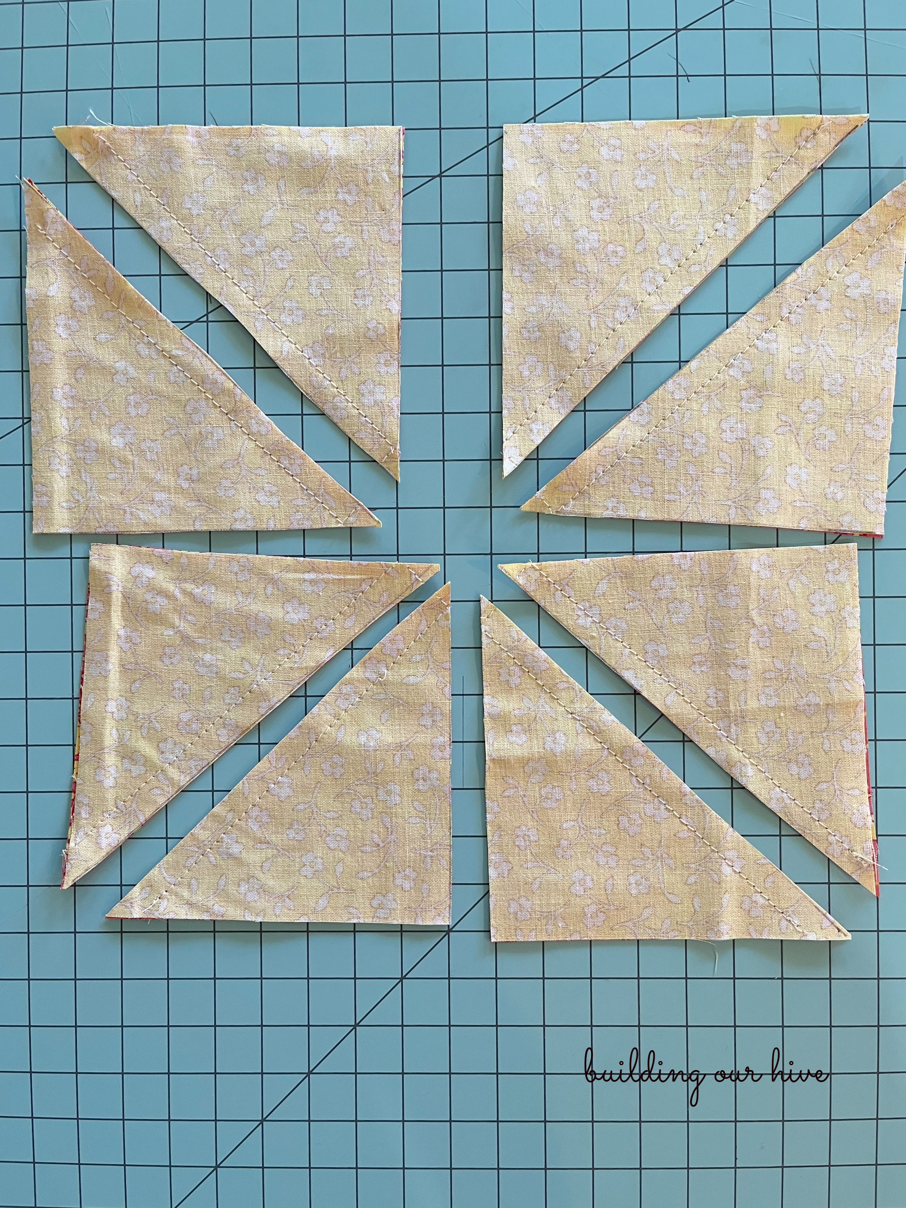 Take your 8 squares and the extra 3 1/4" square cut out of the background fabric,